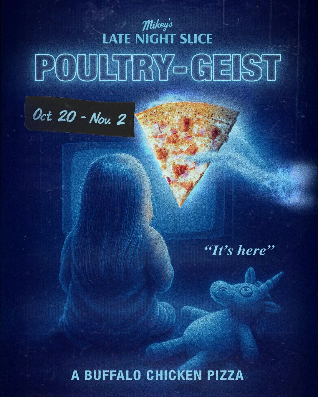 This isn’t just a buffalo chicken pizza—it’s a full-blown possession. One bite and the Poultry-Geist will have you speaking in clucks, squawks, and unholy burps straight from the afterlife. Eat if you dare…